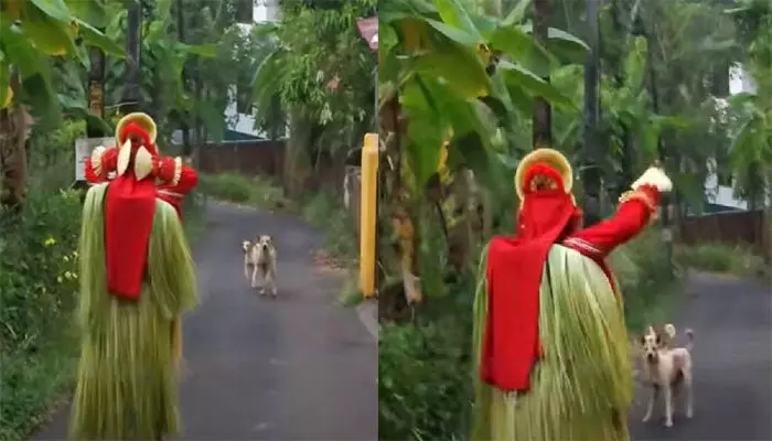 തെയ്യക്കോലത്തിന് നേരെ കുരച്ചുചാടി തെരുവുനായ്ക്കള്