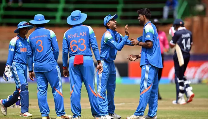 ബുലവായോ: അണ്ടര് 19 ലോകകപ്പില് അമേരിക്കയ്ക്കെതിരെ ആറ് വിക്കറ്റിന് തകർത്ത് ഇന്ത്യക്ക് വിജയത്തുടക്കം. സിംബാബ്വെയിലെ ബുലവായോയിൽ നടന്ന മത്സരത്തിൽ, മഴയെ തുടർന്ന് 37 ഓവറിൽ 96 റൺസായി പുനർനിശ്ചയിച്ച വിജയലക്ഷ്യം ഇന്ത്യ 17.2 ഓവറിൽ നാല് വിക്കറ്റ് നഷ്ടത്തിൽ മറികടന്നു. അഞ്ച് വിക്കറ്റ് പ്രകടനത്തിലൂടെ അമേരിക്കയെ 107 റൺസിന് ഒതുക്കിയ ഹെനില് പട്ടേലും, പുറത്താകാതെ 42 റൺസ് നേടി ഇന്ത്യയെ വിജയത്തിലെത്തിച്ച അഭിഗ്യാന് കുണ്ടുവും ഇന്ത്യൻ വിജയത്തിൽ നിർണായക പങ്ക് വഹിച്ചു. അഞ്ച് വിക്കറ്റ് സ്വന്തമാക്കിയ ഇന്ത്യൻ പേസർ ഹെനിൽ പട്ടേലാണ് കളിയിലെ താരം. മത്സരത്തിൽ ടോസ് നഷ്ടപ്പെട്ട് ആദ്യം ബാറ്റ് ചെയ്ത അമേരിക്ക 35.2 ഓവറിൽ 107 റൺസിന് ഓൾ ഔട്ടായി. 52 പന്തിൽ 36 റൺസെടുത്ത നിതീഷ് സുധിനി ആയിരുന്നു അമേരിക്കയുടെ ടോപ് സ്കോറർ. സാഹിൽ ഗാർഗ് (16), അർജ്ജുൻ മഹേഷ് (16), അദ്നിത് ജാംബ് (18) എന്നിവരാണ് രണ്ടക്കം കടന്ന മറ്റ് താരങ്ങൾ. ഇന്ത്യൻ ബൗളിംഗിൽ ഹെനിൽ പട്ടേൽ 16 റൺസ് വഴങ്ങി അഞ്ച് വിക്കറ്റ് വീഴ്ത്തി എതിരാളികളെ തകർത്തു. രണ്ടാം ഓവറിൽ അമ്രീന്ദർ ഗില്ലിനെ (1) പുറത്താക്കി വിക്കറ്റ് വേട്ടയ്ക്ക് തുടക്കമിട്ട ഹെനിൽ, ഉത്കർഷ് ശ്രീവാസ്തവ (0), അർജ്ജുൻ മഹേഷ് (16) എന്നിവരെയും മടക്കി. ദീപേഷ് ദേവേന്ദ്രൻ സാഹിൽ ഗാർഗിന്റെ (16) വിക്കറ്റ് നേടി. ഇതോടെ ഒരു ഘട്ടത്തിൽ 39 റൺസിന് അഞ്ച് വിക്കറ്റ് എന്ന നിലയിലേക്ക് അമേരിക്ക വീണിരുന്നു. അമേരിക്കൻ ഇന്നിംഗ്സിന് ശേഷം മഴയെത്തിയതോടെ കളി തടസ്സപ്പെട്ടു. മഴ മാറിയപ്പോൾ, ഇന്ത്യയുടെ വിജയലക്ഷ്യം 37 ഓവറിൽ 96 റൺസായി പുതുക്കി നിശ്ചയിച്ചു. എന്നാൽ, വിജയലക്ഷ്യം ചെറുതായിരുന്നിട്ടും ഇന്ത്യക്ക് തുടക്കത്തിൽ പിഴച്ചു. ഓപ്പണർ വൈഭവ് സൂര്യവൻഷി (2), വേദാന്ത് ത്രിവേദി (2) എന്നിവരെ റിത്വിക് അപ്പിടി പുറത്താക്കി. ക്യാപ്റ്റൻ ആയുഷ് മാത്രെയെ (19) റിഷഭ് ഷിംപിയും മടക്കിയതോടെ 25 റൺസിന് മൂന്ന് വിക്കറ്റ് എന്ന നിലയിലേക്ക് ഇന്ത്യ വീണു. പിന്നീട് വിഹാൻ മൽഹോത്രയും (18) പുറത്തായി. ഈ ഘട്ടത്തിലാണ് അഭിഗ്യാന് കുണ്ടുവിന്റെ തകർപ്പൻ ഇന്നിംഗ്സ് ഇന്ത്യയുടെ രക്ഷക്കെത്തിയത്. 41 പന്തിൽ ഒരു സിക്സും അഞ്ച് ഫോറുമടക്കം പുറത്താകാതെ 42 റൺസ് നേടിയ കുണ്ടു, കൗഷിക് ചൗഹാനുമൊത്ത് (10 നോട്ടൗട്ട്) ചേർന്ന് ഇന്ത്യയെ വിജയത്തിലേക്ക് നയിച്ചു.