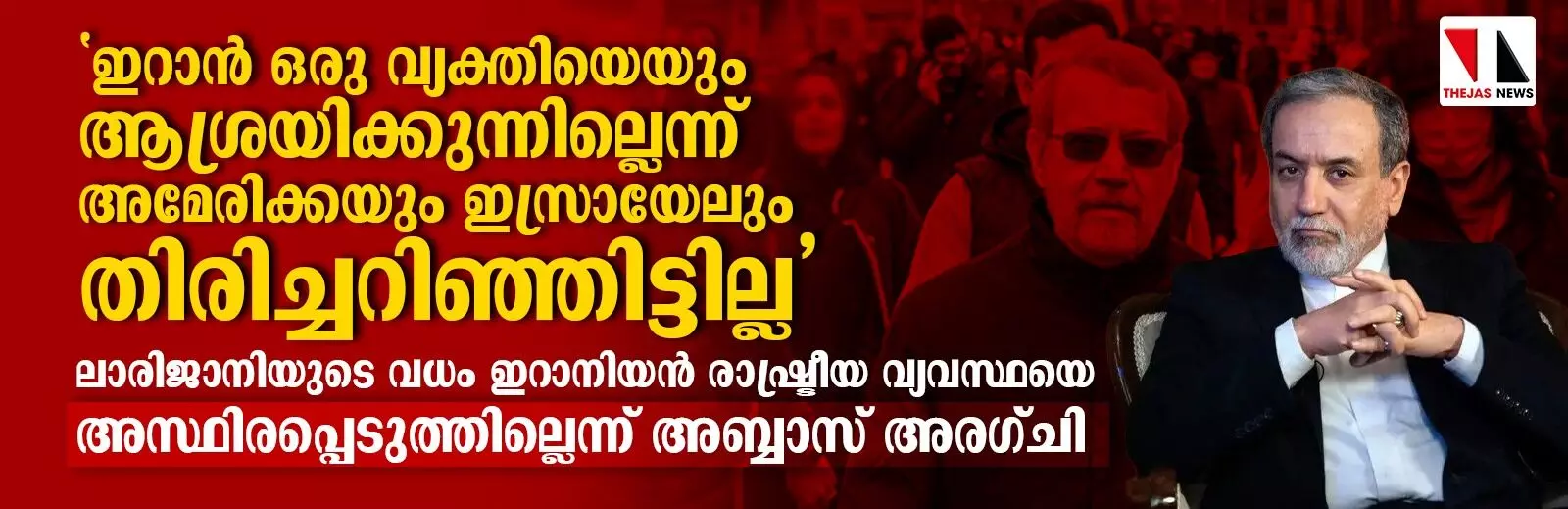 ഇറാൻ ഒരു വ്യക്തിയെയും ആശ്രയിക്കുന്നില്ലെന്ന് അമേരിക്കയും ഇസ്രായേലും തിരിച്ചറിഞ്ഞിട്ടില്ലെന്ന് ഇറാൻ വിദേശകാര്യ മന്ത്രി അബ്ബാസ് അരാഗ്ചി. 'ഒരൊറ്റ വ്യക്തിയുടെ