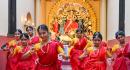 ദുർഗ പൂജയുടെ ഭാഗമായി നൃത്തം ചെയ്യുന്ന പെൺകുട്ടികൾ, വെസ്റ്റ് ബംഗാളിൽ നിന്നുള്ള കാഴ്ച ഒക്ടോബർ രണ്ടിനാണ് നവരാത്രി വ്രതം അവസാനിക്കുന്നത്. ദുർഗാ പൂജയ്ക്കായി ഒരുക്കിയിരിക്കുന്ന ദേവീ